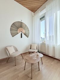 Der Praxisraum ist ausgestattet mit einer Shiatsu-Matte, einer mobilen Massageliege sowie einer kleinen Besprechungsecke mit zwei Stühlen und einem Tisch.